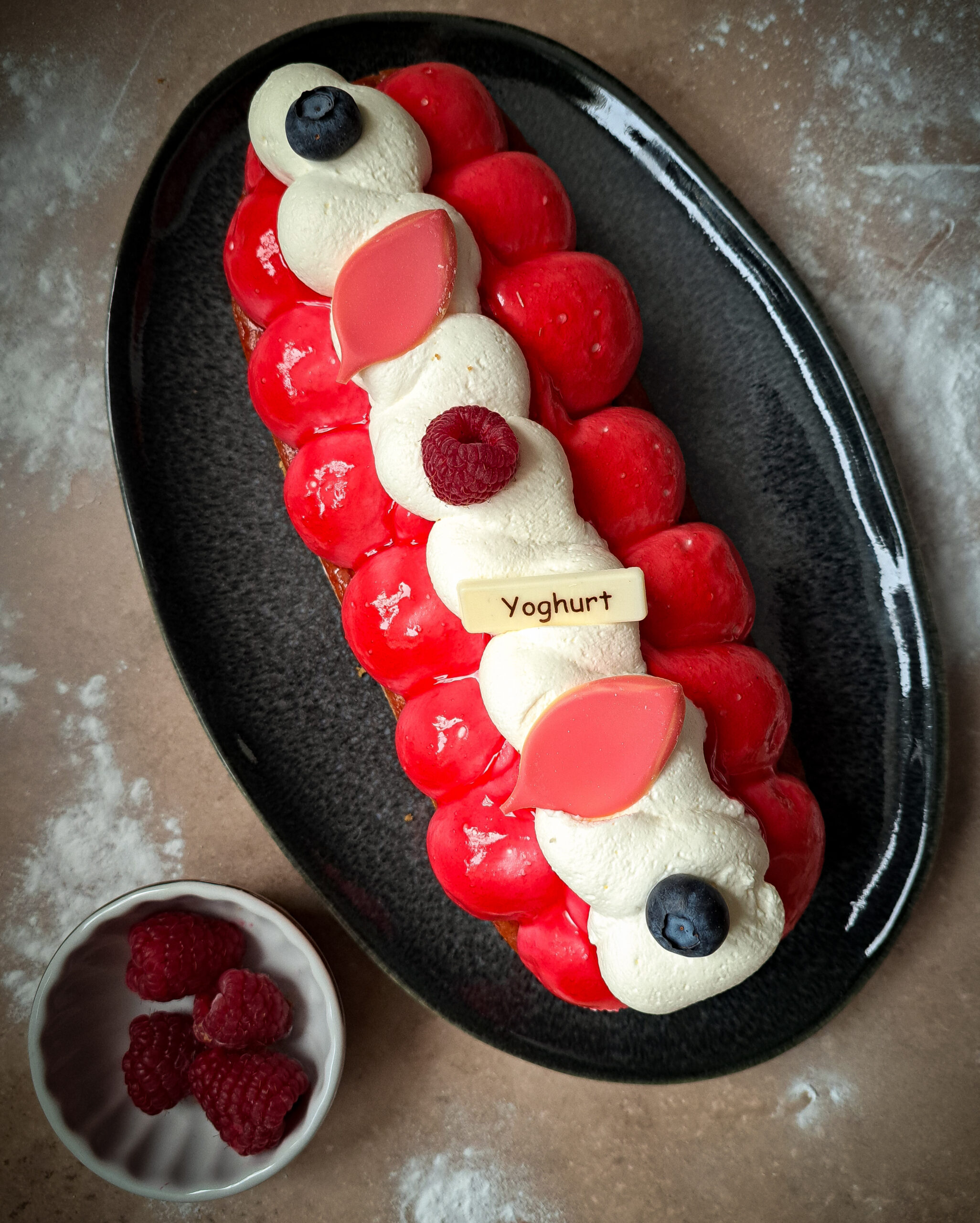 Frisse frambozencrème met yoghurt op een knapperige bodem. Fris en feestelijk.